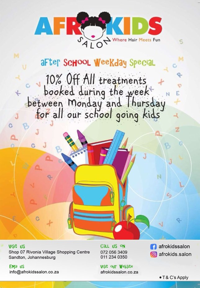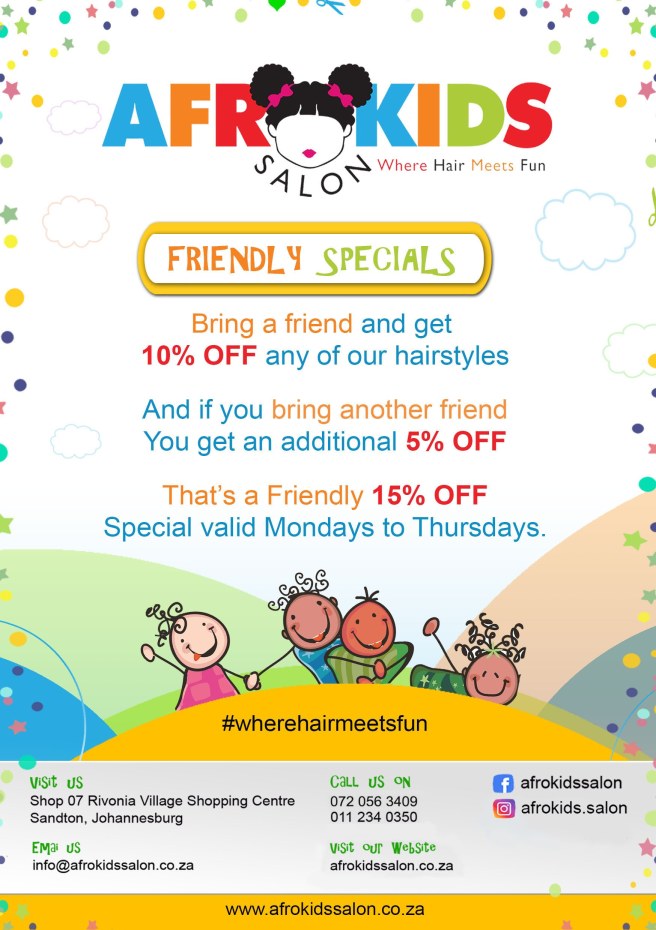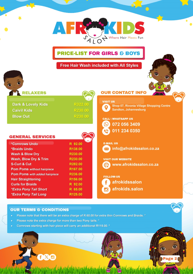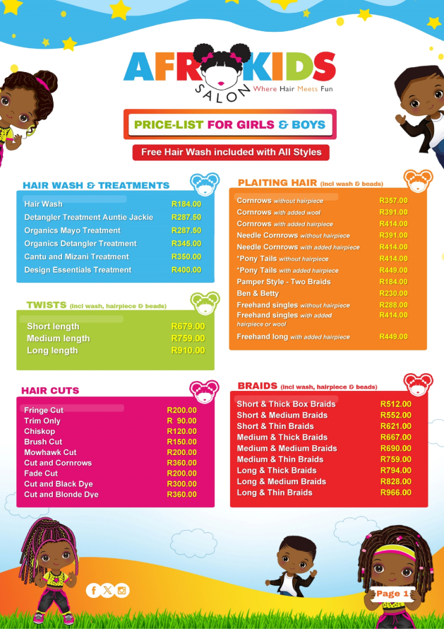We have specials available for our kiddies and our pricelist filled with our hairstyle prices,